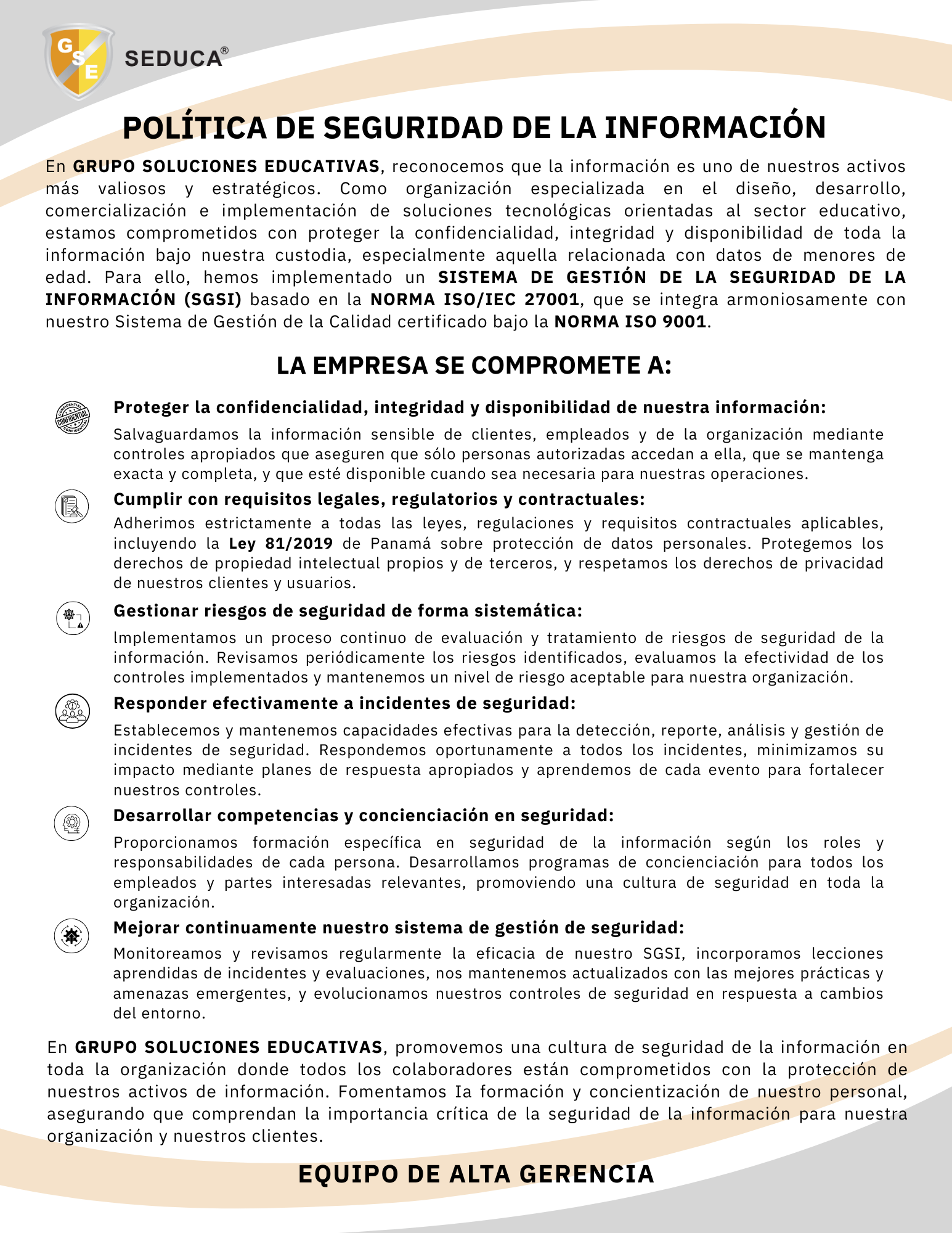 En GRUPO SOLUCIONES EDUCATIVAS, reconocemos que la información es uno de nuestros activos más valiosos y estratégicos. Como organización especializada en el diseño, desarrollo, comercialización e implementación de soluciones tecnológicas orientadas al sector educativo, estamos comprometidos con proteger la confidencialidad, integridad y disponibilidad de toda la información bajo nuestra custodia, especialmente aquella relacionada con datos de menores de edad. Para ello, hemos implementado un SISTEMA DE GESTIÓN DE LA SEGURIDAD DE LA INFORMACIÓN (SGSI) basado en la NORMA ISO/IEC 27001, que se integra armoniosamente con nuestro Sistema de Gestión de la Calidad certificado bajo la NORMA ISO 9001.